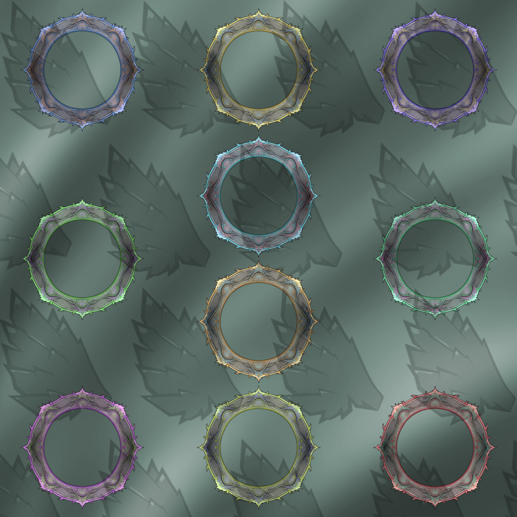 1 Zip file containing: - 1 PSD (2000x2000 px) in all colors - 10 PNG frames (2000 x 2000 px) High quality. - 10 PNG frames (560 x 560 px) for Roll20 and other VTTs