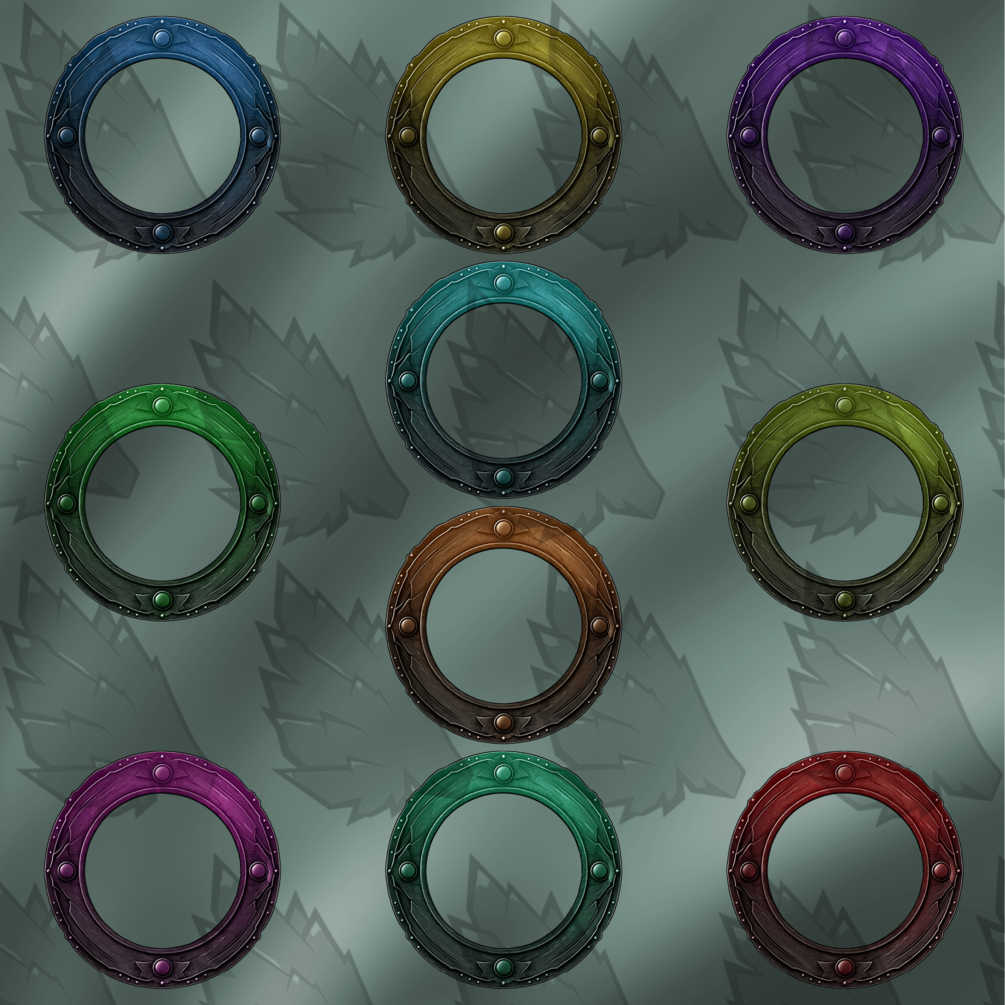 1 Zip file containing: 6 Frames each - 1 PSD (2000x2000 px) in all colors - 10 PNG frames (2000 x 2000 px) High quality. - 10 PNG frames (560 x 560 px) for Roll20 and other VTTs