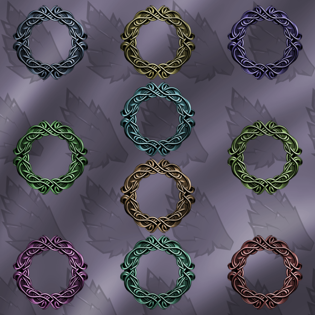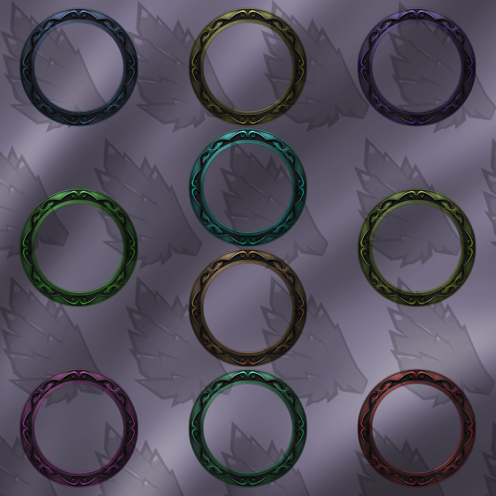1 Zip file containing: 6 Frames each - 1 PSD (2000x2000 px) in all colors - 10 PNG frames (2000 x 2000 px) High quality. - 10 PNG frames (560 x 560 px) for Roll20 and other VTTs