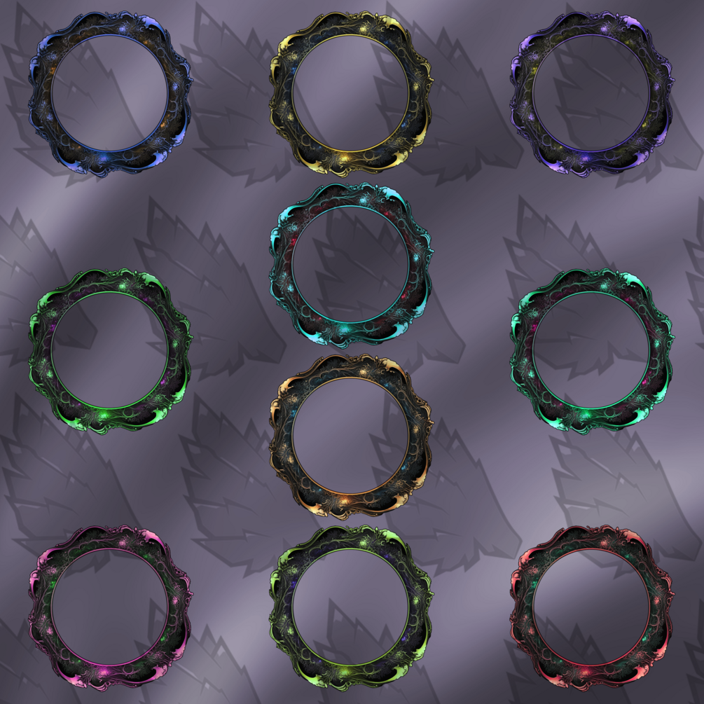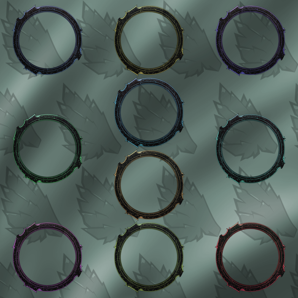 1 Zip file containing: 6 Frames each - 1 PSD (2000x2000 px) in all colors - 10 PNG frames (2000 x 2000 px) High quality. - 10 PNG frames (560 x 560 px) for Roll20 and other VTTs